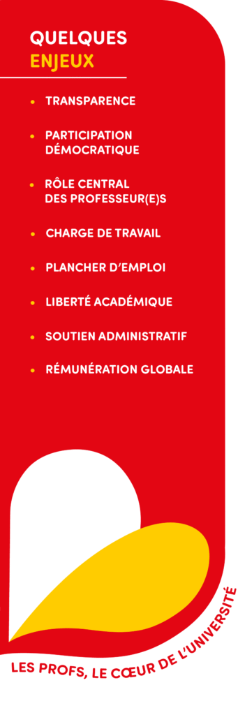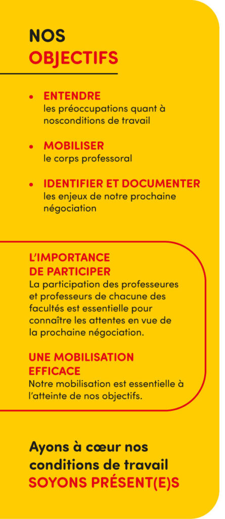 Vos réalités et vos priorités nourriront directement la préparation du cahier de charges : c’est en partageant vos préoccupations que nous pourrons bâtir une négociation solide et représentative. C’est l’occasion de revoir nos priorités à la lumière de l’évolution de nos conditions de travail et de la réalité universitaire. La tournée des facultés vise à dégager, avec vous, les enjeux qui auront le plus d’impact sur notre pratique professorale.