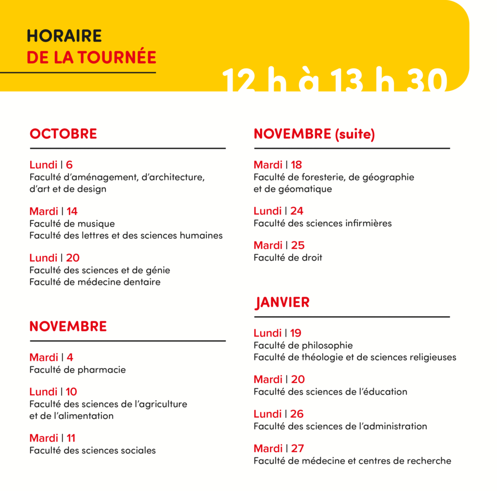 La tournée se déroulera d’octobre 2025 à janvier 2026, selon un calendrier établi pour chacune des facultés. Toutes les rencontres auront lieu de 12 h à 13 h 30, dans un esprit d’échange ouvert et accessible. Vous recevrez un rappel par courriel environ une semaine avant la rencontre prévue pour votre faculté, et il sera également possible d’assister à une séance organisée dans une autre faculté si votre horaire ne vous permet pas d’être présent(e) à celle de la vôtre.